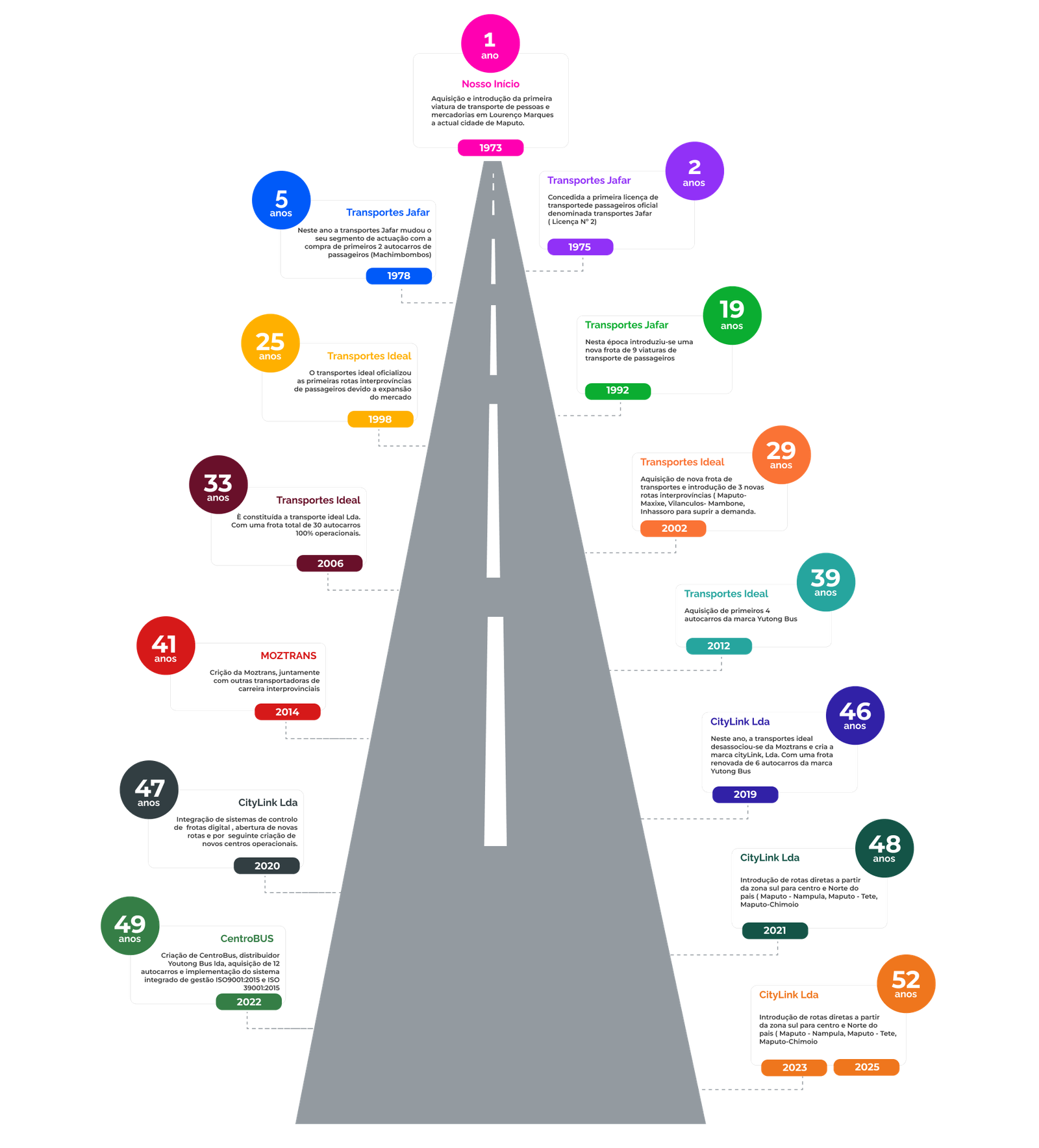 Desde 1973, quando iniciámos atividade sob o nome Transportes Jafar, temos evoluído continuamente para responder às necessidades do país. Em 2019, com a criação da CityLink, LDA, consolidámos a nossa identidade como uma marca moderna, robusta e centrada no cliente.